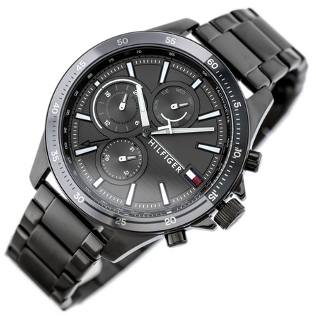 Zegarek Tommy Hilfiger 1791719 to stylowy i nowoczesny dodatek dla mężczyzn ceniących klasyczny design z nutą sportowego charakteru. Jego głęboka grafitowa kolorystyka nadaje mu eleganckiego wyglądu, a stalowa koperta i bransoleta podkreślają solidność wykonania. Na tarczy znajdują się subtarcze wskazujące dzień tygodnia, datę oraz czas w formacie 24-godzinnym, co czyni ten model nie tylko estetycznym, ale i praktycznym wyborem na co dzień.