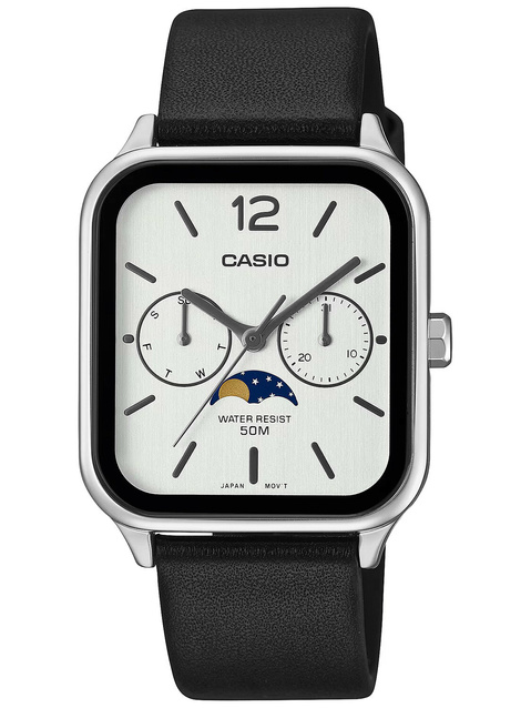The watch's envelope is made of stainless steel, which guarantees durability and resistance to mechanical damage. The white dial with date and moon phases adds subtle elegance to the watch. The classic leather strap ensures comfortable wear and adjustment to different wrist sizes.