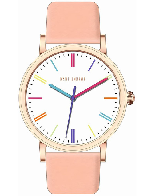 Zegarek wyróżnia się ponadczasową, różową kolorystyką i został wykonany z wysokiej jakości stali szlachetnej. Jego skórzany, delikatny pasek idealnie współgra z okrągłą, metalową kopertą, na której umieszczona została starannie zaprojektowana tarcza. Wskazówki w tym modelu są kolorowe i delikatne, nadając całości lekkości. Cyferblat jest chroniony przez szkło mineralne, które zapewnia odporność na zarysowania i uszkodzenia.