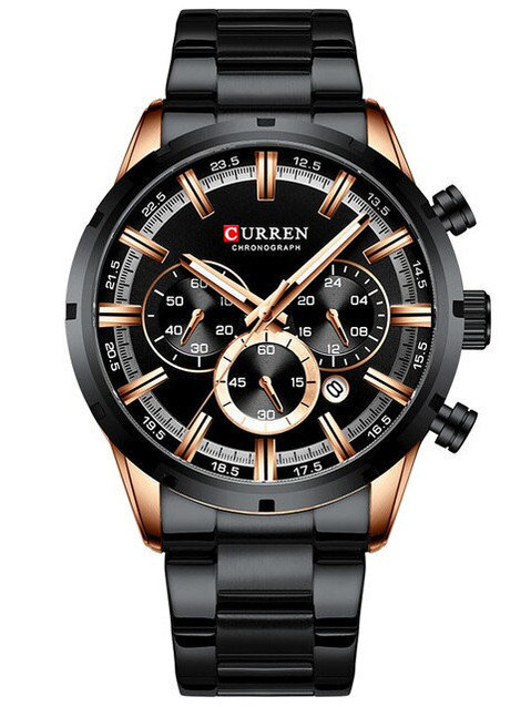 Zegarek męski CURREN 8355 to elegancki męski zegarek idealny zarówno do eleganckiego ubioru, jak i do noszenia na co dzień. Na czarnej tarczy z indeksem w kolorze różowego złota, otoczonej czarnym pierścieniem znajdziemy datownik dnia miesiąca oraz subtarcze będące wskazaniami chronografu i czasu dobowego.